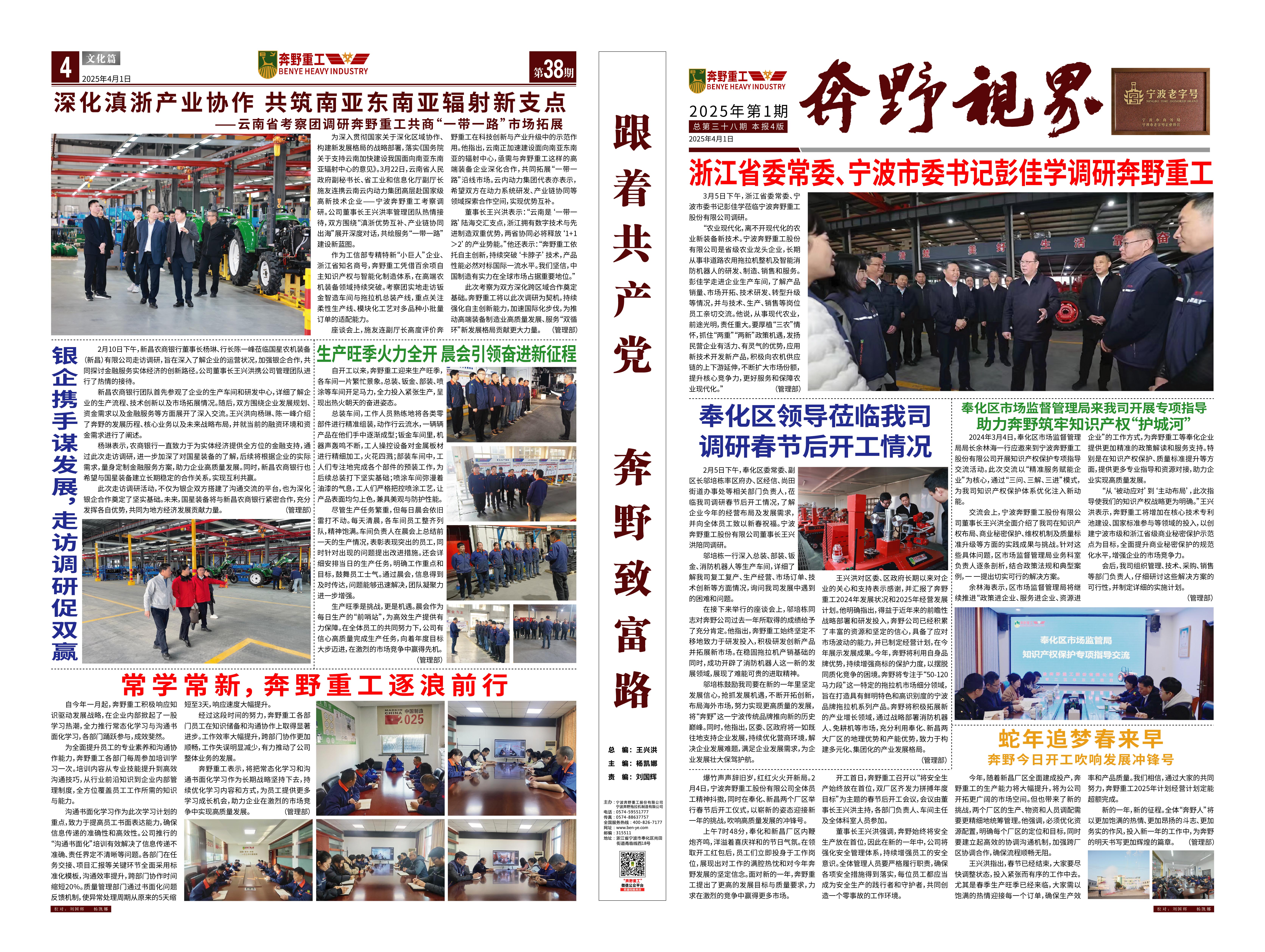 是一家非道路用農(nóng)用拖拉機(jī)整機(jī)及部件設(shè)備研發(fā)、制造、銷(xiāo)售、服務(wù)為一體的涉農(nóng)科研型生產(chǎn)企業(yè),專(zhuān)業(yè)生產(chǎn)寧波型奔野系列拖拉機(jī),是國(guó)家高新技術(shù)企業(yè)、工信部專(zhuān)精特新“小巨人”企業(yè)、浙江省知名商號(hào),寧波市級(jí)農(nóng)業(yè)龍頭企業(yè)、脫貧攻堅(jiān)-產(chǎn)業(yè)合作樣板企業(yè)、鄉(xiāng)村振興先進(jìn)集體,在寧波、新昌、吉林等地均設(shè)有生產(chǎn)基地,占地150多畝。公司現(xiàn)有技術(shù)骨干30多人,零部件自制化水平達(dá)到30%以上。公司目前擁有發(fā)明專(zhuān)利10余項(xiàng),實(shí)用新型專(zhuān)利、外觀(guān)專(zhuān)利、版權(quán)近50項(xiàng),擁有自主的知識(shí)產(chǎn)權(quán)保護(hù)品牌。公司所處的農(nóng)業(yè)農(nóng)機(jī)領(lǐng)域是國(guó)家重點(diǎn)關(guān)注和保障的、關(guān)乎國(guó)計(jì)民生的領(lǐng)域,得到國(guó)家和地方政府的大力支持,行業(yè)發(fā)展勢(shì)頭良好。