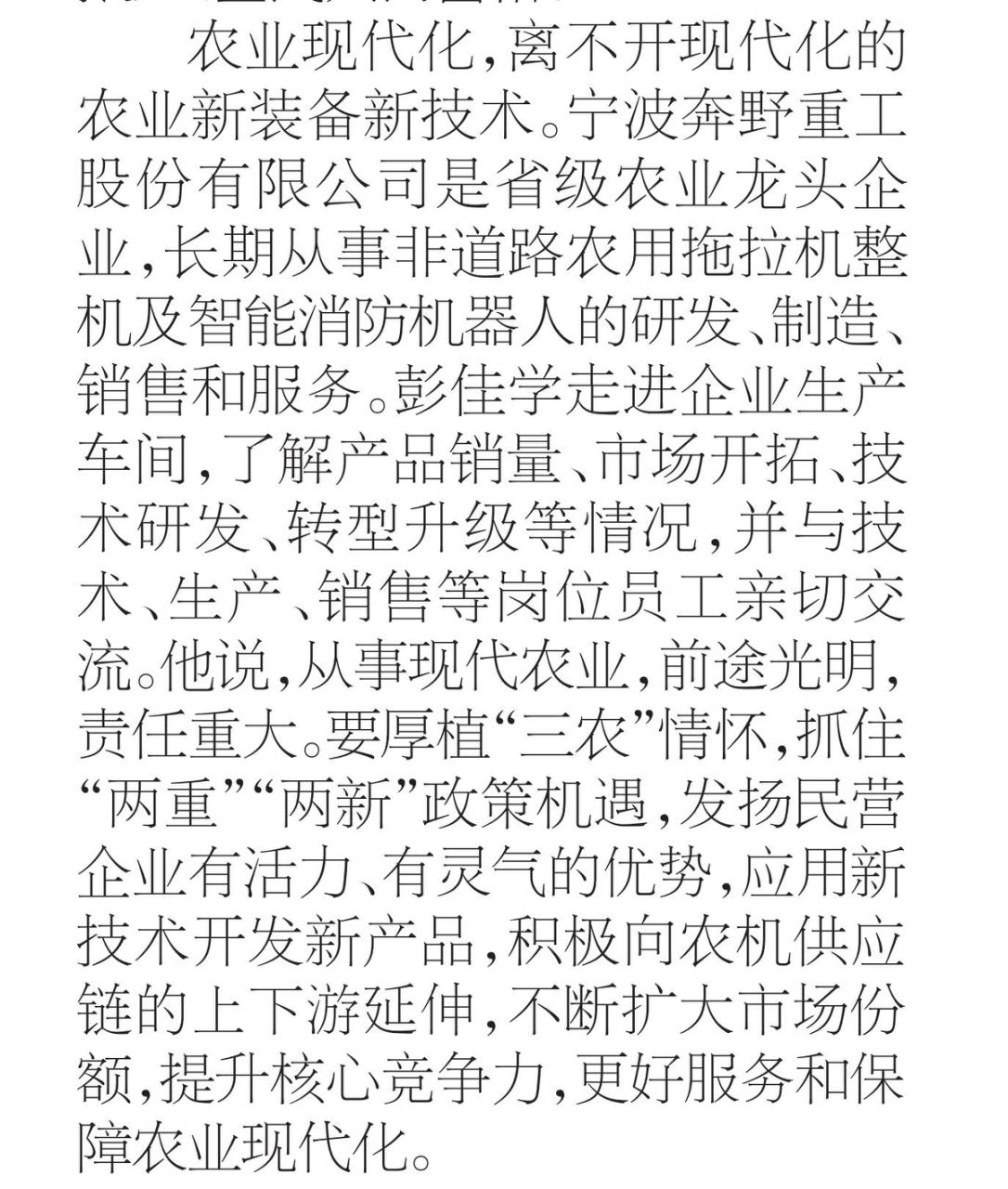 “農(nóng)業(yè)現(xiàn)代化,離不開現(xiàn)代化的農(nóng)業(yè)新裝備新技術(shù)。寧波奔野重工股份有限公司是省級農(nóng)業(yè)龍頭企業(yè),長期從事非道路農(nóng)用拖拉機整機及智能消防機器人的研發(fā)、制造、銷售和服務。彭佳學走進企業(yè)生產(chǎn)車間,了解產(chǎn)品銷量、市場開拓、技術(shù)研發(fā)、轉(zhuǎn)型升級等情況,并與技術(shù)、生產(chǎn)、銷售等崗位員工親切交流。他說,從事現(xiàn)代農(nóng)業(yè),前途光明,責任重大。要厚植“三農(nóng)”情懷,抓住“兩重”“兩新”政策機遇,發(fā)揚民營企業(yè)有活力、有靈氣的優(yōu)勢,應用新技術(shù)開發(fā)新產(chǎn)品,積極向農(nóng)機供應鏈的上下游延伸,不斷擴大市場份額,提升核心競爭力,更好服務和保障農(nóng)業(yè)現(xiàn)代化。”