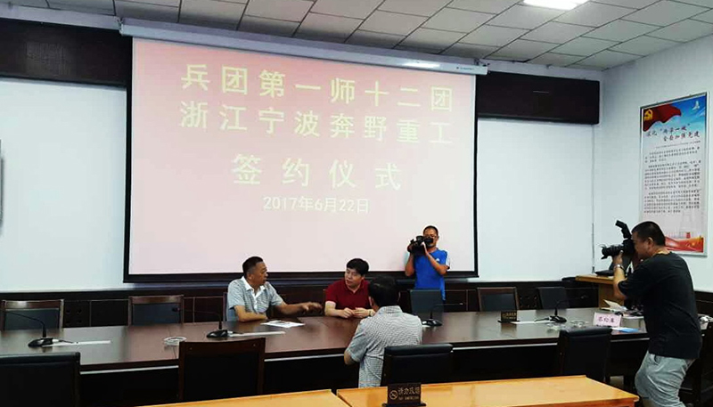 6月22日,寧波奔野重工董事長王興洪等公司領(lǐng)導(dǎo)在新疆出席兵團(tuán)一師十二團(tuán)項(xiàng)目合作簽約儀式。