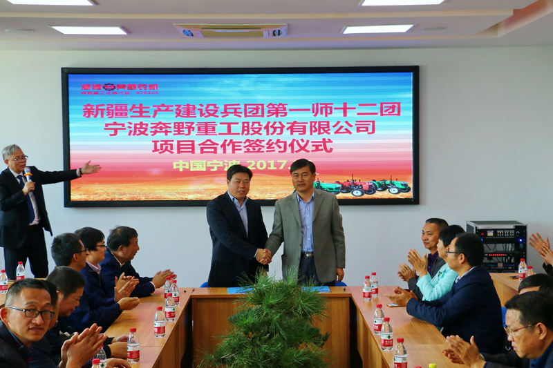 在三樓會議室,全體經(jīng)銷商朋友見證了寧波奔野重工股份有限公司與新疆生產(chǎn)建設(shè)兵團(tuán)第一師十二團(tuán)舉行的項目合作簽約儀式,為公司進(jìn)一步拓展新疆市場、擴(kuò)大產(chǎn)能、配合國家政策、做好援疆工作提供了可靠的保證。